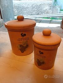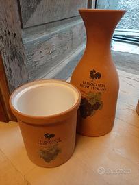 Terracotta from tuscany con gallo e vite. 2 barattoli con coperchio e 1 senza, caraffa per il vino con una macchia.