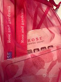 Set composto da incensi e sacchetti profumati alla Rosa e Gardenia, contenuti in una busta regalo rosa.