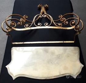 Vendo elegante set da ingresso o attività commerciali, in ferro battuto dorato, design Pierluigi Colli, composto da Specchiera finemente sagomata con cimasa scolpita, con piedi d'appoggio su consolle lavorata con gambe arcuate e piedi d'appoggio, piano d'appoggio in onice sagomata e smussata. Le misure della specchiera : altezza 142 cm, larghezza 85 cm. La consolle compresa di piano in onice: Altezza 45 cm, larga58 cm, profonda 25 cm.