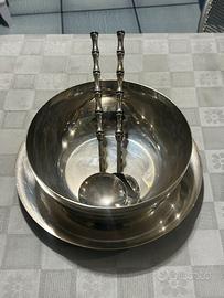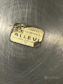 Vendo elegante set da tavola vintage composto da insalatiera/ciotola grande, vassoio/piatto di base e 2 posate da servizio (cucchiaione + forchettone), con bellissimi manici stile bamboo. Il set è marchiato/etichettato Fabbrica Argenteria ALLEVI – Ponte Nuovo di Torgiano (PG) – Italy, produzione italiana di qualità, ideale per chi ama la tavola classica e gli accessori raffinati. Perfetto per insalate, macedonie, punch o come centrotavola. Condizioni buone con normali segni del tempo e leggera ossidazione da argenteria (vedi foto): con una semplice lucidatura torna brillantissimo. Disponibile per visione dal vivo. Spedizione tracciata possibile con imballo accurato. Prezzo: 79 € trattabile con buon senso.