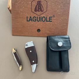 Set Laguiole composto da accendino, cm 9,5 x 3, coltellino, cm 7,5 chiuso e cm 13 aperto, e custodia per entrambi gli oggetti, cm 9,5 x cm
