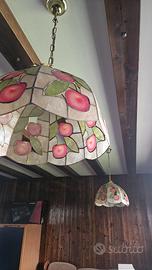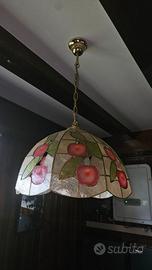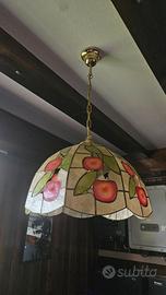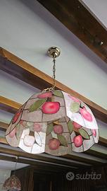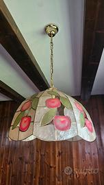 Splendido set coordinato di 3 lampadari a sospensione originali degli anni '70/'80, realizzati artigianalmente in vera conchiglia Capiz (nota per la sua bellissima lucentezza perlacea e traslucenza). I lampadari presentano un raffinato decoro floreale/fruttato (ciliegie/mele) nei toni del rosso e del verde, con bordature in metallo dorato. La lavorazione a pannelli permette una diffusione della luce calda e d'atmosfera, perfetta per una cucina, una taverna o un ambiente in stile Boho-Chic/Rustico. Linea elettrica originale perfettamente funzionante, smontati di recente per la vendita.