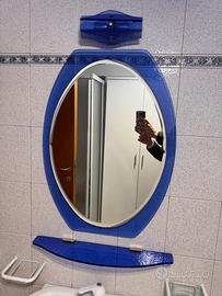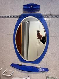 Set composto da specchio, sotto specchio e lampadario vintage, anni 50/60. Colore blu. Ottime condizioni. Tutto funzionante. Materiale rigorosamente vetro.