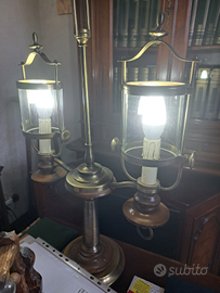 Importante lampadario con la sua lampada da tavolo, ottone e cristallo
