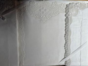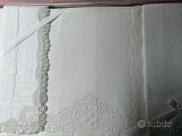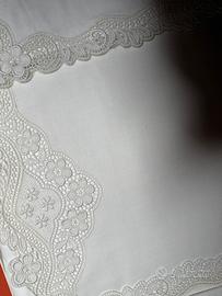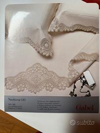 Set completo Gabel Nocturne 112 per letto matrimoniale. 240 × 280. Lenzuola sopra, sottolenzuolo, 2 federe a 3 volani. Federe 50 x 80. Completo con applicazione di pizzo macrame svizzero a balza continua sul lenzuolo e sulle federe, realizzato su pelle ovo di puro cotone. Nuovo, mai usato, con scatola originale