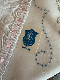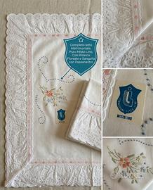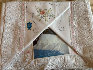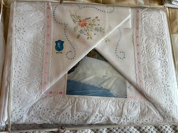 Splendido set da letto matrimoniale vintage, autentico pezzo da corredo, ancora nella sua confezione originale e mai utilizzato. Il set si distingue per la delicatezza dei colori e la ricchezza delle rifiniture in pizzo. Dettagli e Lavorazione: • Materiale: Pregiato Mistolino (garantito dal bollino "Commissione Tutto Lino"), un tessuto che unisce la freschezza del lino alla praticità del cotone. • Decorazioni: * Ricca balza in Pizzo Sangallo traforato su lenzuolo e federe. • Inserto in passanastro rosa satinato che corre lungo tutto il bordo. • Delicati ricami floreali a mano in tonalità pastello (arancio, azzurro e giallo) con motivi a "punto erba" e piccoli nodini azzurri. • Stile: Romantico, Shabby Chic, classico italiano. Contenuto della confezione: • 1 Lenzuolo sopra matrimoniale. • 1 Lenzuolo sotto matrimoniale. • 2 Federe coordinate con pizzo e ricami. • Confezione originale protettiva trasparente. Stato dell'oggetto: Nuovo da fondo di magazzino/corredo. Il tessuto è intonso, i colori dei ricami e del nastro sono ancora perfettamente brillanti. Presenta ancora il cartellino di garanzia del produttore. Un'ottima idea regalo per amanti della biancheria d'epoca o per chi vuole dare un tocco bon-ton alla propria camera da letto.