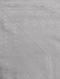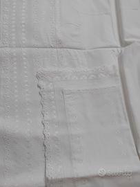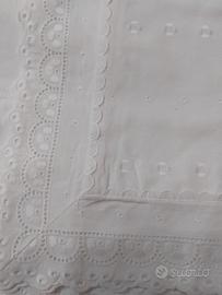 in puro cotone,con larga balza in pizzo sangallo,su batista di cotone.la federa è interamente in batista di cotone ricamato,con balza in pizzo sangallo.mai usato.