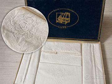 Vendo set lenzuola vintage originale marca LUXE. ✔️ 100% cotone ✔️ 5 pezzi completi ✔️ Ricami eleganti tono su tono ✔️ Mai utilizzato Composizione: lenzuolo sopra lenzuolo sotto 2 federe 1 federa grande Con scatola originale dell’epoca (anni ’60/’70 circa), con normali segni del tempo. Set conservato benissimo, ideale per chi cerca biancheria vintage autentica o per corredo. 💬 Scrivimi per info o offerte