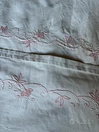 Elegante set di lenzuola vintage per letto matrimoniale ( sotto sopra e 2 federe) con delicato ricamo floreale a mano di colore rosa. Perfetto per aggiungere un romantico alla tua camera da letto.