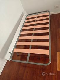 Letto singolo misure 90*190, composto da rete con spondina laterale + rete a scomparsa delle stesse dimensioni. Perfetto per bambini e per avere un letto in più. Ai piedi del letto è stata applicata una piccola barra x alzarlo leggermente e permettere di usare sotto un materasso più alto.