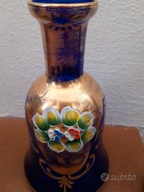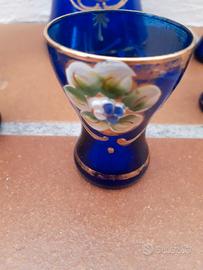 Set liquore vintage in vetro di Murano blu cobalto e oro composto da una bottiglia e cinque bicchierini.