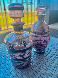Splendido set liquore degli anni 50 composto da 2 bottiglie con tappo e 8 bicchierini coordinati, realizzati in vetro viola ametista con raffinate decorazioni in argento.
