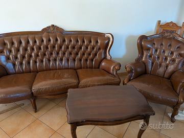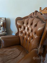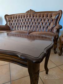 divano poltrone e tavolo stile gotico ottocentesco. divano legno intagliato a mano con cuoio come poltrone. tavolo il legno a mano.