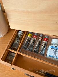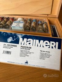 Cassetta in legno Maimeri Polycolor con colori vinilici fini. Tutti i materiali sono pertettamente nuovi, mai utilizzati, conservati nella loro confezione originale come da negozio. Cassetta solida ed elegante, adatta a uso professionale, studio artistico o come idea regalo di qualità. Acquistata al prezzo di 120€