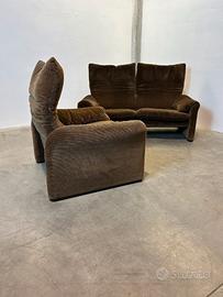 Il Maralunga, icona assoluta del design italiano, è stato creato nel 1973 dal genio di Vico Magistretti per Cassina. Questo divano due posti largo 166 cm, accompagnato dalla sua poltrona coordinata, rappresenta uno dei modelli più amati e riconoscibili del Novecento, ancora oggi in produzione e ammirato in tutto il mondo.La sua silhouette avvolgente, morbida e rassicurante nasconde un'innovazione geniale: lo schienale regolabile in altezza. Grazie a una semplice catena da bicicletta inserita nell'imbottitura, i poggiatesta possono sollevarsi o abbassarsi con un gesto, trasformando il divano da conversazione formale a comoda chaise longue per il relax totale. Un pugno dato da Cesare Cassina al primo prototipo diede vita a questa soluzione rivoluzionaria, diventata leggenda del design.Realizzato in tessuto originale color marrone corduroy (o velluto a coste), questo esemplare vintage conserva intatta l'autenticità degli anni '70-'80: la texture calda e tattile del tessuto, leggermente vissuto ma in ottimo stato generale, dona carattere e patina unica al pezzo. Le forme generose, i braccioli importanti e la base squadrata bassa enfatizzano il comfort estremo, reso possibile da un'imbottitura soffice in poliuretano espanso e ovatta di poliestere.Perfetto per un living contemporaneo o per chi ama il mid-century con un tocco bohemien, questo Maralunga due posti + poltrona si inserisce con naturale eleganza in ambienti moderni o eclettici. Le dimensioni compatte (166 cm di larghezza) lo rendono ideale anche per spazi non enormi, senza sacrificare nulla in termini di presenza scenica e comodità.Un classico senza tempo, robusto, comodo come pochi altri e con quel fascino irresistibile del design italiano d'autore. Un investimento destinato a durare generazioni, da vivere ogni giorno con il piacere di un pezzo che ha fatto la storia.
