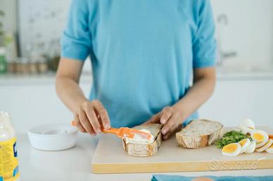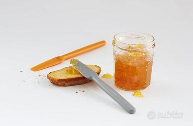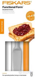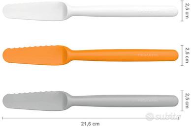 Set di coltelli marca FISKAR in plastica colorata per la colazione . Utili per spalmare burro , marmellata o miele e tagliare un cornetto . Presa salda con impugnatura ergonomica , set comprende tre coltelli di colore arancio , grigio e bianco lavabili in lavastoviglie