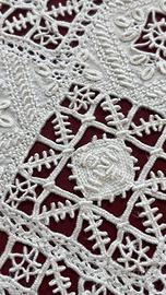 Il ricamo è uno sfilato tipo reticello, eseguito completamente a mano: la trama del tessuto è stata sfilata e ricostruita con motivi geometrici, barrette, ragnetti e riempimenti decorativi.