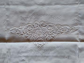 Lenzuolo sopra: inserti in pizzo dal disegno floreale ricamato a mano, con festoni e cordoncino