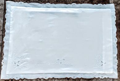 Originale completo matrimoniale, riccamente ricamato a mano con deliziosi inserti ad intaglio e punto rete. E' abbinato alle due federe coordinate, anch'esse ricamate e bordate su 4 lati della balza. La composizione dei ricami nel lenzuolo, si sviluppa ininterrottamente per tutta la lunghezza del risvolto e idem sulle federe. Colore bianco puro, 100% cotone di peso leggero, morbido e fresco. Mai usato è nuovo e perfettamente conservato, senza difetti o segni del tempo.