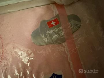 Elegante set di lenzuola matrimoniali (misura 240x280) color rosa confetto con balza bianca lavorata.