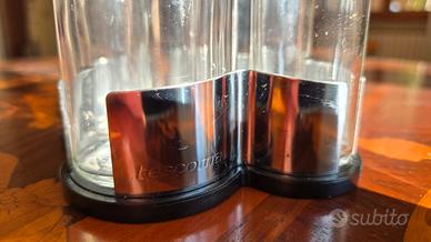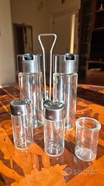 Ménage set da condimento da tavola per olio, aceto, sale, pepe con portastuzzicadenti marca Tescoma. I contenitori per olio e aceto sono antigoccia e facilmente richiudibili ruotando il tappo. Materiale: vetro e acciaio.