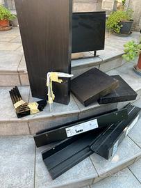 Set di mensole nere Ikea di varie dimensioni e modelli, alcune con tasselli ancora montati, ma mancano molte delle viti. È in vendita esattamente quello che si vede (un po’ impolverato, ma è tutto materiale di due anni fa, quindi molto recente, si vede dalle etichette). Nella foto di gruppo, quello dietro a tutti ha un cassetto che ne occupa buona parte della larghezza. Smontate per far spazio a un mobile, sono in ottime condizioni. Se è possibile è meglio il ritiro sul posto perché insieme sono piuttosto pesanti (tre sono in metallo, ma anche le altre effetto legno sono molto solide).