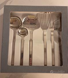 Set di mestoli da cucina nuovo composto da 7 pezzi realizzati in acciaio inossidabile 18/10 di altissima qualità, con finitura lucida. Composizione del set: 1 mestolo cm. 9 1 mestolo cm. 6 1 schiumarola cm. 11 1 pala per fritti 1 forchettone 1 cucchiaione 1 barra appendimestoli Consegna diretta provincia Treviso