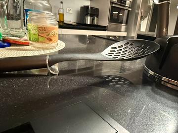 Set di mestoli e non solo, girevole in plastica dura con la base con cui appoggiarli e una base che sporge su ogni mestolo per farsì la cucina non si sporchi.
