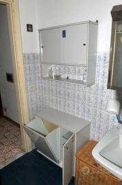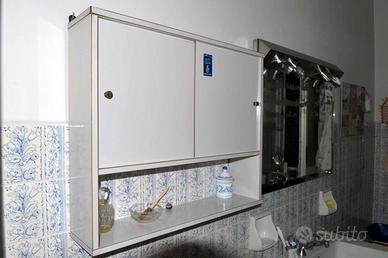 Modernariato. Set mobile bagno anni 50 comprendente portabiancheria, mobiletto con ripiano interno in vetro, mobiletto pensile con ante scorrevoli, pomelli e mensole originali. larghezza c. 70 pensile profondo cm. 16, mobile basso profondo cm 30