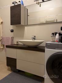 Vendo elegante set mobile bagno completo, caratterizzato da un design asimmetrico contemporaneo. Il mobile gioca sul contrasto tra il calore del legno scuro venato e la luminosità del laccato panna lucido.