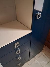 Vendo l'intero blocco di mobili bagno (comunque separabili per il trasporto), lavabo compreso, con ripiani bianchi e sportelli laccati blu oltremare. Così come sono coprono una larghezza totale di 192cm. L'altezza del blocco più basso (lavabo e mobiletti laterali) è di cm 82 e la profondità maggiore (blocco lavabo) è di cm 62. L'elemento laterale a destra è alto cm 182.
