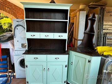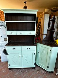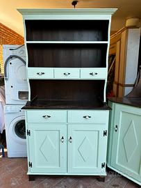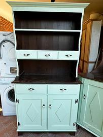Set mobili stile shabby chic composto da credenza con alzata e mobile laterale coordinato. Colore verde salvia con piano scuro a contrasto, ideale per arredamento country, rustico o provenzale. ✔️ Set coordinato ✔️ Ampio spazio contenitivo ✔️ Perfetti per cucina, taverna o casa di campagna ✔️ Subito utilizzabili Condizioni buone, con normali segni del tempo che ne valorizzano lo stile. Vendibili anche separatamente. 📍 Ritiro a mano