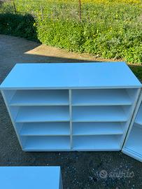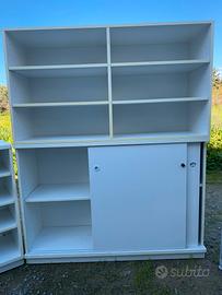 Vendesi set da ufficio composto da: - due mobili ad ante scorrevoli (uno non presente in foto) 127cm x 87cm x 43cm. - due mobili con ripiani 105cm x 86cm x 42cm. - mobiletto a due ante+ vano 65cm x 61cm x 52cm. - due mobiletti a ripiani in ferro e truciolato 98cm x 105cm x 31cm Si vendono al prezzo di 200€ tutti insieme, non si vendono singolarmente ( con un'aggiunta si effettua il trasporto dove richiesto). Incluso nel prezzo si cedono altri ripiani e pareti per comporre scaffali simili a quelli presenti nell'ultima foto. I mobili sono stati usati ma si presentano in ottime condizioni, solidi e robusti, non hanno mai preso umidità o muffa. Primo contatto telefonico al numero 3 2 8 3 4 2 9 2 2 1