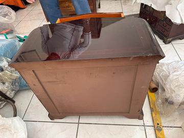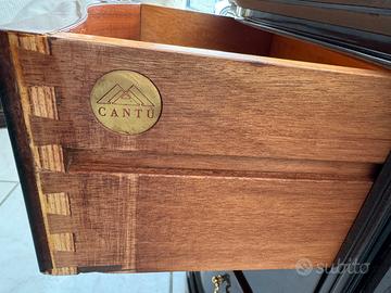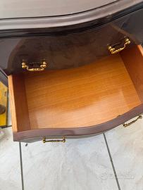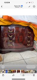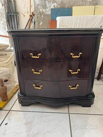 Vendo due comodini e un comò grande in legno massello, probabilmente artigianato italiano, con marchio Cantù, simbolo di qualità. Il comò è in stile barocco, con finitura laccata nera e pomelli in ottone dorato, perfetto per chi cerca mobili eleganti e di carattere. I comodini sono abbinati e completano il set. Ottime condizioni, ideale per arredamento classico o come pezzi di design da collezione.
