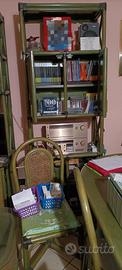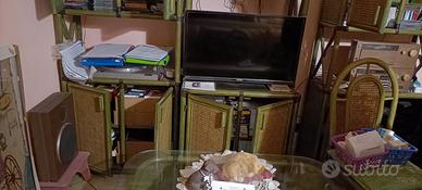 Mobili in legno colore verde. Tavolo ovale, sei sedie, divano, tavolino basso con vetro, tre mobiletti con antine.