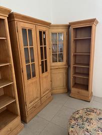 Set mobili legno massello chiaro con divano: mobile ad angolo, mobile con 7 cassetti (settimino), mobile con vetrina , 2 mobili a colonna, divano.