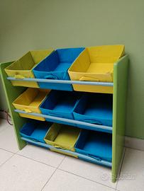 Set 2 mobili organizer da cameretta in legno costituito da: 1 Mobiletto inclusi 9 cassetti di stoffa richiudibili 1 Mobiletto identico al precedente ma senza cassetti Misure mobile: L66, P29, H60