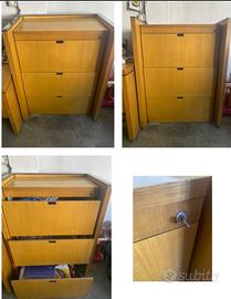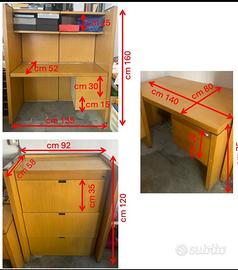 Set mobili per ufficio composto da scrivania con cassetto e lucchetto, mobile portadocumenti a 3 cassettoni con lucchetto e mobile con piano lavoro, 2 cassetti e mensola.