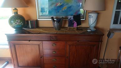 A seguito vendita abitazione di famiglia si vende set (o singoli pezzi) mobili in ottimo stato per soggiorno/sala pranzo composto da: 1) Tavolo da pranzo (160 cm) in legno rettangolare allungabile con num. 6 sedie in abbinamento in tessuto bianco [VENDUTO] ; 2) Mobile credenza basso in legno abbinato al tavolo (larg. 200 cm x alt. 100 cm x 60 cm) con serie di 6 cassetti centrale, due ampi cassetti e due ante ideale per conservare tovaglie, piatti, bicchieri, etc.. 3) Mobile-Bar (alt. circa 150 cm x 90 cm larg.) con cassetti, anta a ribalta e doppia anta nella parte bassa utilizzabile anche come credenza; 4) Mobile basso a 4 ante per conservare piatti, bicchieri e poggia oggetti (dim. 190 x 70 x 50) colore legno abbinato al resto.