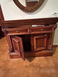 •Cassettiera/Consolle con due cassetti e due ante, ideale come mobile da ingresso o sala, con lavorazioni decorative sui lati e maniglie in ottone.