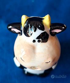 Originariamente si trattava di una coppia di mini saliera e pepiera in ceramica a forma di mucca, progettata per rimanere unita grazie a un piccolo magnete posizionato sulla "bocca". Attenzione: ad oggi manca uno dei due pezzi (vedi foto 1) ma l'unità rimanente conserva il suo fascino d'epoca e il carattere unico, impreziosita da qualche piccola scheggiatura alle punte delle corna (vedi foto 4 e 5).