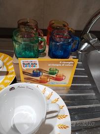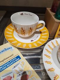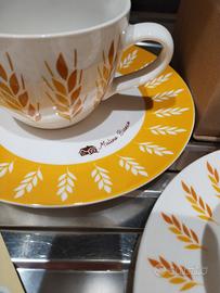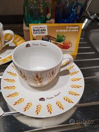 Set Mulino Bianco composto da 2 tazze con fantasia Spiga di grano e 2 piattini coordinati. Tutto nuovo in confezione originale. 4 tazzine Nutella in REGALO in vetro colorato sfumato in edizione limitata.
