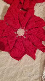 new Christmas set consisting of a bag or pocket that can be completely opened and acts as a round holder, made of felt, diameter 33 cm, two curtain ties with little red roses crocheted in cotton and completed with a ribbon with a mother-of-pearl effect magnet, a set of tablecloth and napkins with a design and glittered edges, in polyester. 🎄