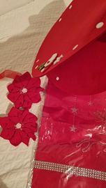 set natalizio nuovo composto da una sacca o tasca completamente apribile e fa da portatutto rotonda, in feltro, diametro cm 33, due fermatende con roselline rosse lavorate all'uncinetto di cotone e completati da nastro con magnete effetto madreperla, set tovaglia e tovaglioli con disegno e bordi brillantinati, in poliestere. 🎄