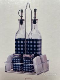 Set nuovo, mai usato, composto da 2 bottiglie in vetro per olio e aceto (altezza 30 cm), saliera e pepiera (altezza 9,5 cm) e 4 ciotoline in ceramica. Consegna a mano in Torino e provincia.