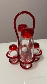 Vendo set olio aceto sale e pepe di Guzzini modello Menage rosso, composto da ampolle in vetro con tappi in plastica rosso trasparente e una base sempre in plastica. Mai usato e senza scatola. Misure 17x15xh22,5 cm