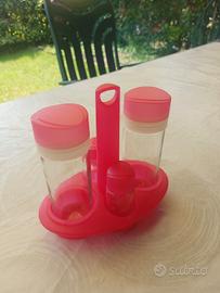 Set completo olio aceto, sale e pepe. Il vasetto è in vetro, i tappi in plastica.