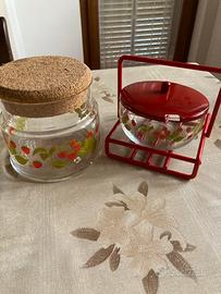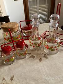 Set oliere saliera formaggiera barattolo co tappo sughero in vetro decorato e supporti in metallo verniciato mai usati vendo in ottime condizioni anche separatamente