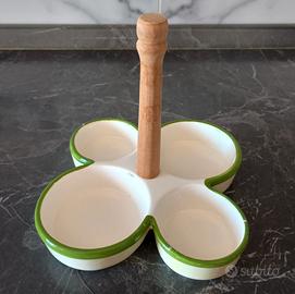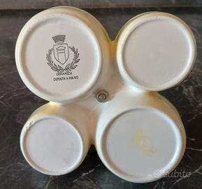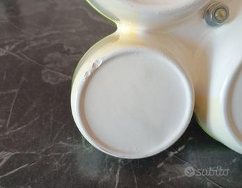 SET OLIO ACETO SALE PEPE IN CERAMICA DIPINTA A MANO Nuovo ma con un lieve difetto nella parte inferiore della base – senza confezione Composto da: - 2 bottigliette per olio / aceto h 12 cm - 2 contenitori per sale / pepe h 8 cm - 1 base in ceramica e manico in legno dimensioni 16 x 16 cm, h 17 cm (con un lieve difetto nella parte inferiore) COME DA FOTO P.S. SE RICHIESTO, DA AGGIUNGERE A CARICO DELL'ACQUIRENTE LE SPESE DI SPEDIZIONE.