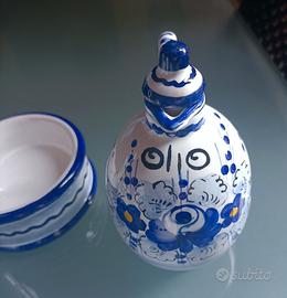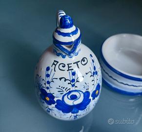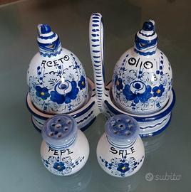Vendo elegante set composto da porta olio, aceto, sale pepe ceramiche DERUTA. Bellissimo colore che ricorda il mare bianco azzurro e blu. Condizioni pari al nuovo!!